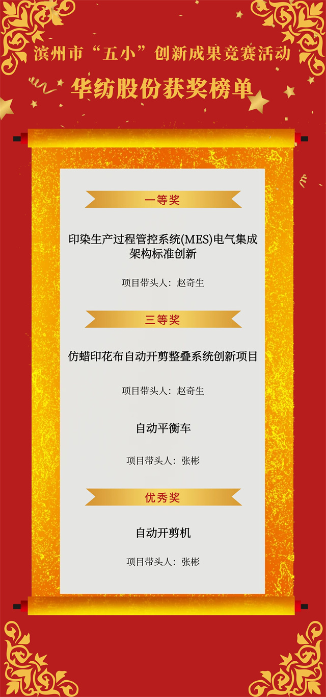 近日,市總工會開展的濱州市“五小”創新成果競賽活動獲獎名單公布,公司申報的4項“五小”競賽創新成果喜獲殊榮,其中,《印染生產過程管控系統(MES)電氣集成架構標準創新》獲一等獎,《仿蠟印花布自動開剪整疊系統創新項目》《自動平衡車》獲三等獎,《自動開剪機》獲優秀獎。